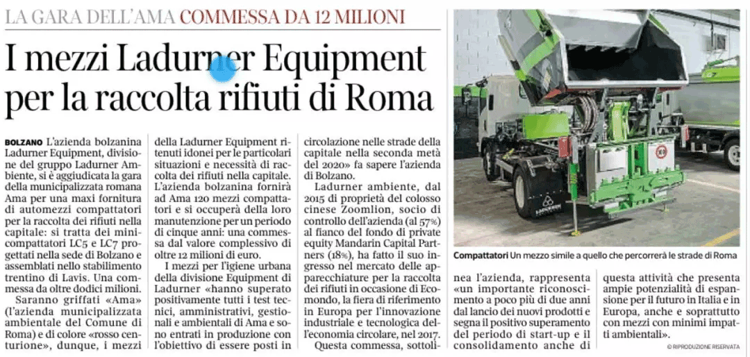 “上門回收,意味著一些狹窄或者擁堵的街區(qū),大車難以通過,只能使用中小型壓縮式垃圾車進(jìn)行收集壓縮轉(zhuǎn)運(yùn)。而公司LC7壓縮式垃圾車正好滿足要求,其小巧而自重輕,容積大,壓縮比高,運(yùn)轉(zhuǎn)效率高。”盈峰環(huán)境海外業(yè)務(wù)負(fù)責(zé)人介紹到。“意大利Ladurner中標(biāo)羅馬環(huán)衛(wèi)裝備億元大單在意大利引起強(qiáng)烈反響,當(dāng)?shù)孛襟w爭相報(bào)道。盈峰中聯(lián)環(huán)衛(wèi)裝備不僅遍布意大利眾多城市,還銷往了波蘭,立陶宛等其他歐洲國家。”