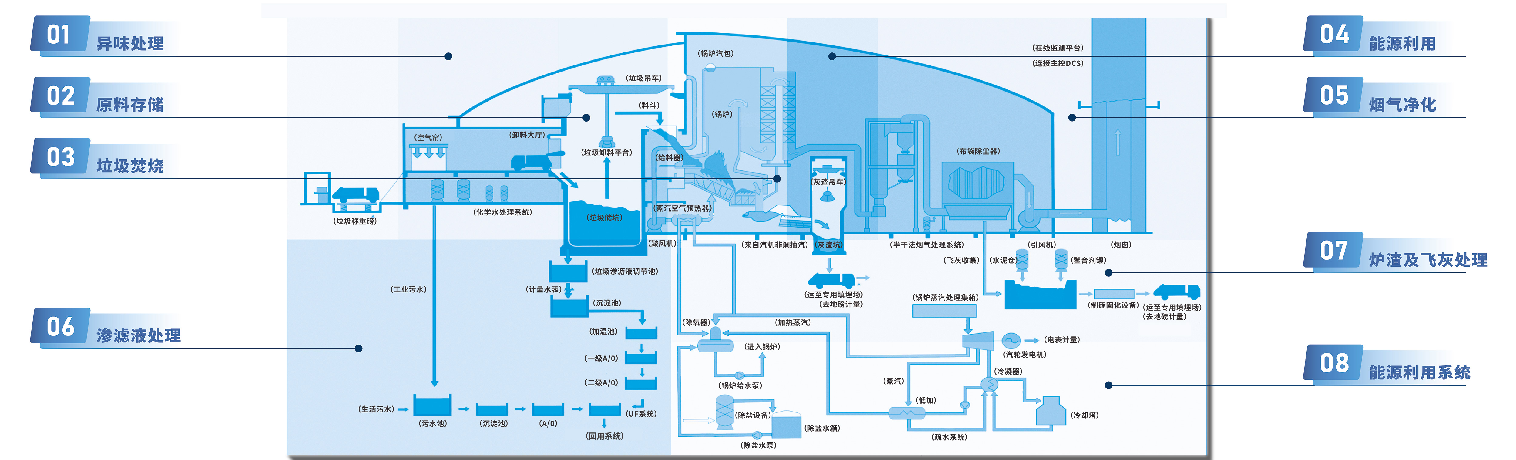 盈峰環(huán)境生活垃圾焚燒發(fā)電處理模式將全流程劃分為八大模塊,構(gòu)建囊括垃圾入庫、儲存、焚燒,煙氣凈化、滲濾液處理、爐渣及飛灰處理、熱能產(chǎn)生、能源利用的八大系統(tǒng)。